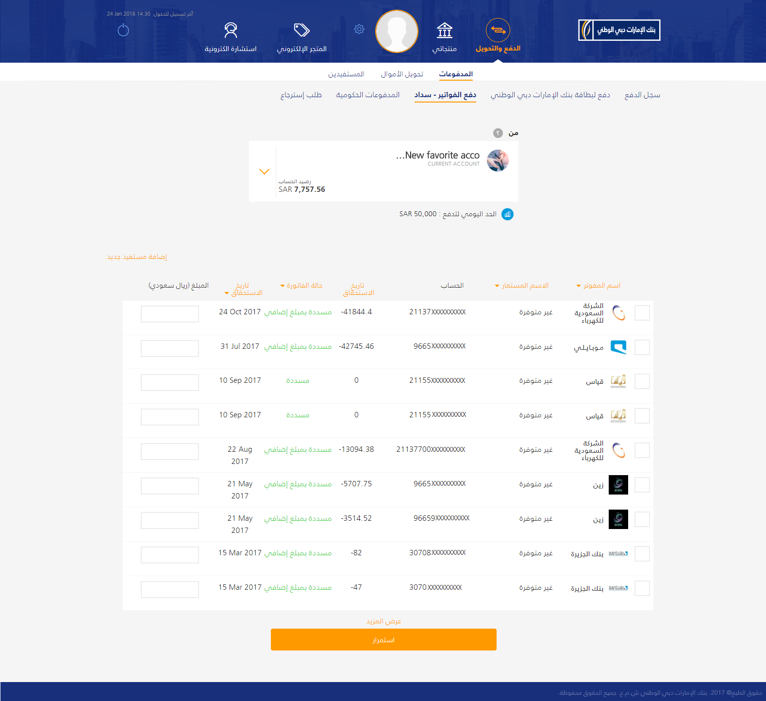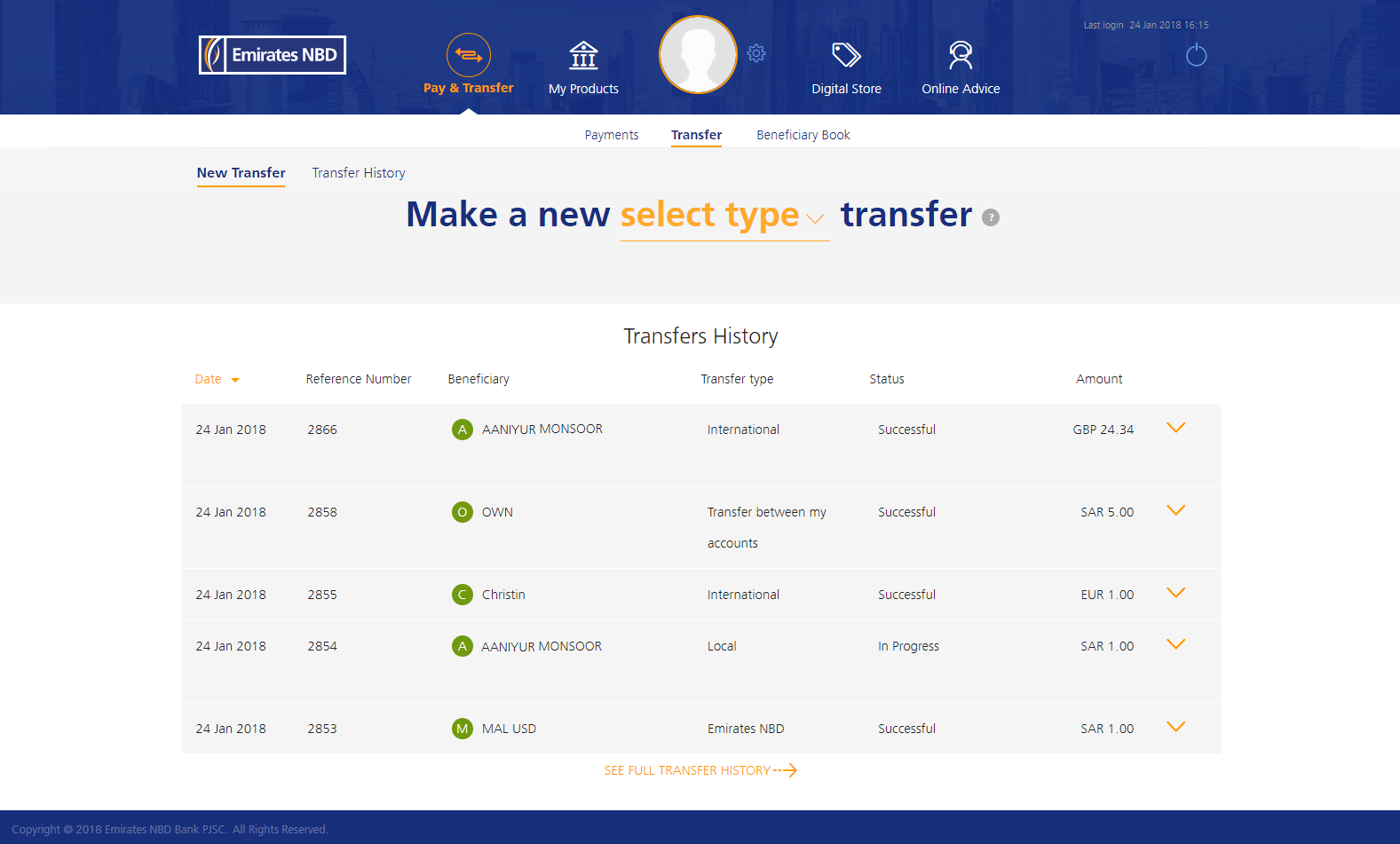 نعم بإستطاعتك رؤية جميع المستفيدين المسجلين للحوالات والفواتير وبطاقاتك الائتمانية