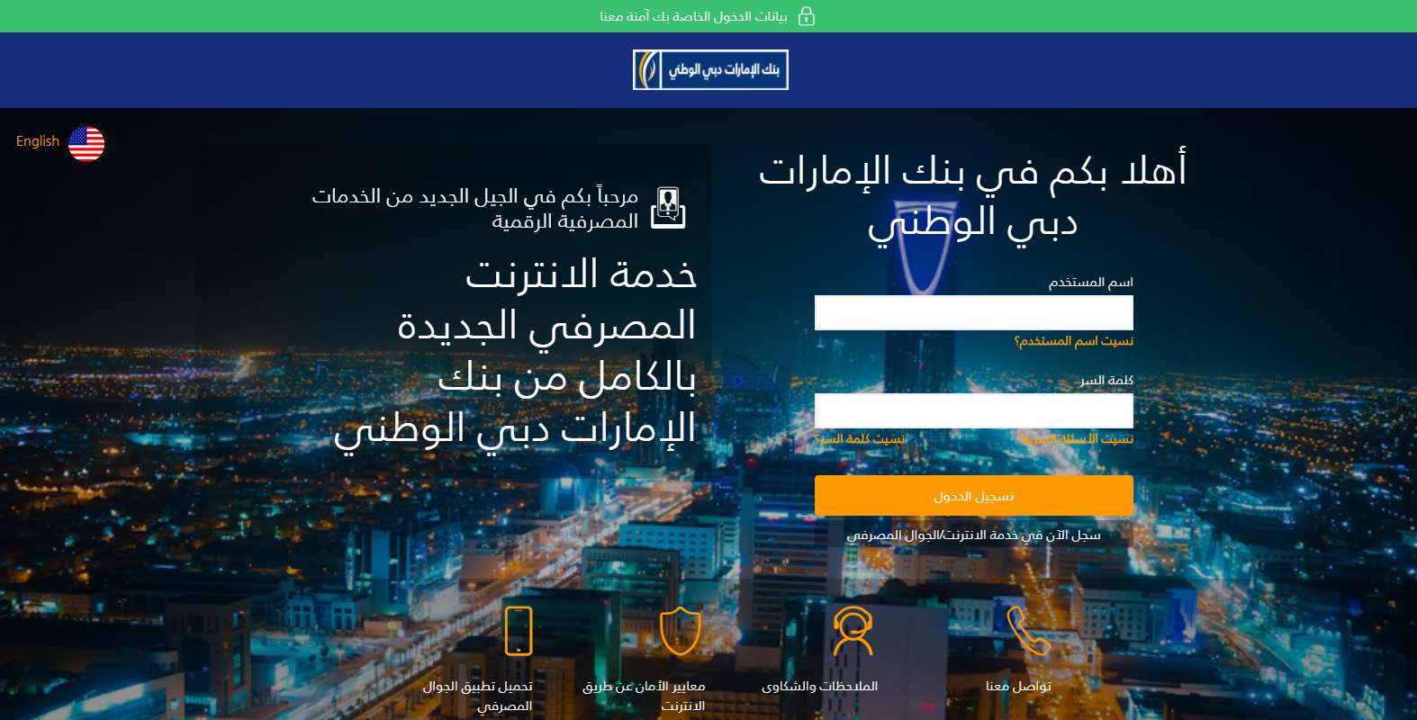 تطبيق الجوال المصرفي آمن ويتيح لك طريقة اسهل وأسرع وأكثر ملائمة في إستخدام هاتفك الجوال اثناء التنقل. يمكنك الدخول الى الخدمات المصرفية عن طريق الهاتف الجوال من بنك الإمارات دبي الوطني عن طريق ادخال اسم المستخدم الخاص بخدمة الانترنت المصرفي و كلمة المرور.